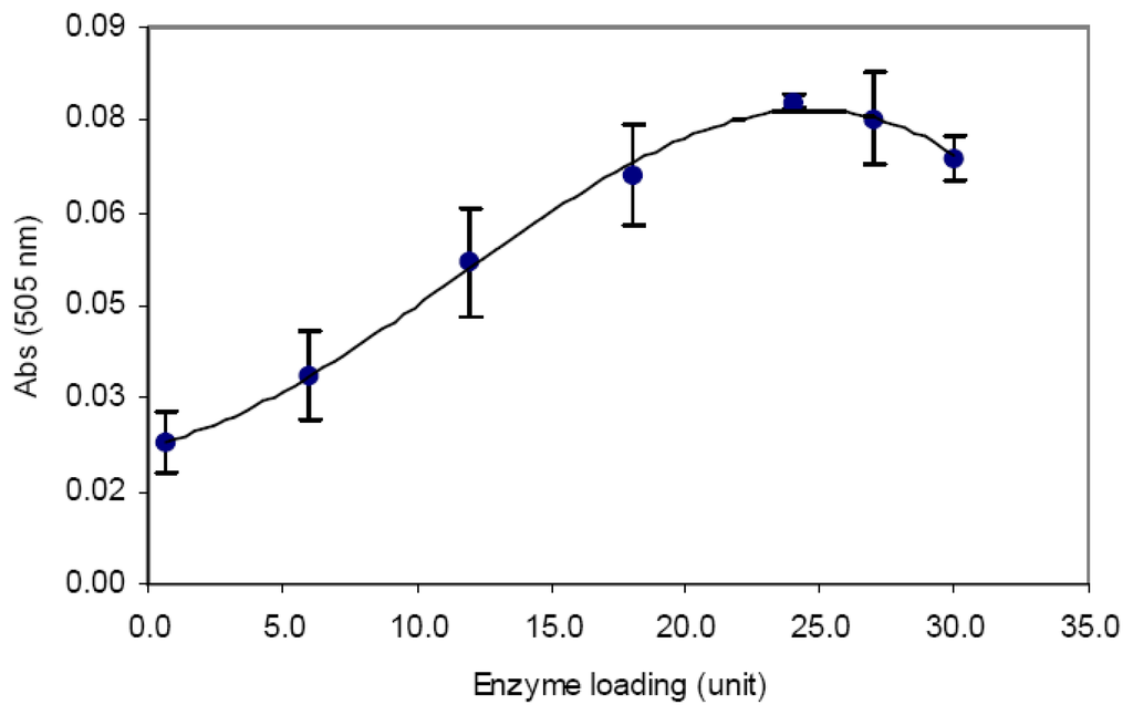 Figure 8 shows the effect of enzyme loading in a chitosan film of fixed area and thickness on the biosensor response. Upon increasing the enzyme loading, the biosensor response increased steeply to reach a maximum value when 24 unit of enzyme was employed. Protein assay was also carried out to estimate the amount of enzyme immobilized in chitosan film using method described by BIO-RAD []. It was found that approximately 50 % of laccase enzyme was entrapped in the chitosan film. Thus, 24 unit of enzyme was used for immobilization in the construction of the biosensor.