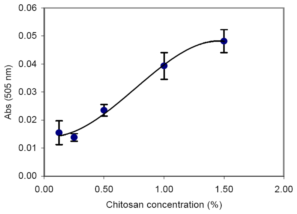 The effect of chitosan concentration on the performance of biosensor response was studied in the concentration range of 0.13-1.5 %. Figure 9 reveals that the biosensor response increases with the increase in chitosan concentration and maximum response was achieved at a chitosan concentration of 1.5 %. Chitosan concentration higher than 1.5 % can not be prepared due to insolubility in 1% acetic acid solution used. Therefore, the concentration of 1.5 % chitosan was used in subsequent studies.
