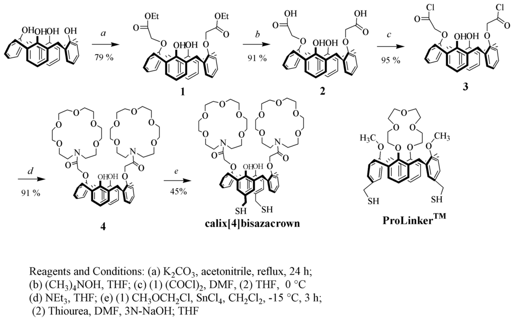 Synthetic scheme of calix[4]bisazacrown and molecular structure of ProLinker™.