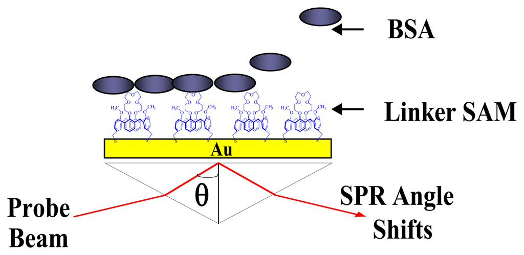 In this study, calix[4]bisazacrown which contains azacrown rings at the lower rim with a common reactive thiol at the upper rim was constructed to monolayer on Au surface. Surface confined calix[4]bisazacrown has potential applications in the development of molecular linker layer for immobilizing protein by selective affinity at the surface. The interaction between BSA and surface confined calix[4]bisazacrown was compared with commercial protein linker system by SPR. The surface concentration of immobilized BSA was higher than that of commercial protein linker system. These results indicate that the bisazacrown as a functional group at the lower rim of calix[4]arene exert a critical effect on the stable affinity toward the protein onto the SAM. In conclusion, the main results of this research showed that the SPR technique and the novel well-designed calixarene derivative SAM are very useful to the development of more efficient biosensing interface through more efficient protein immobilization.