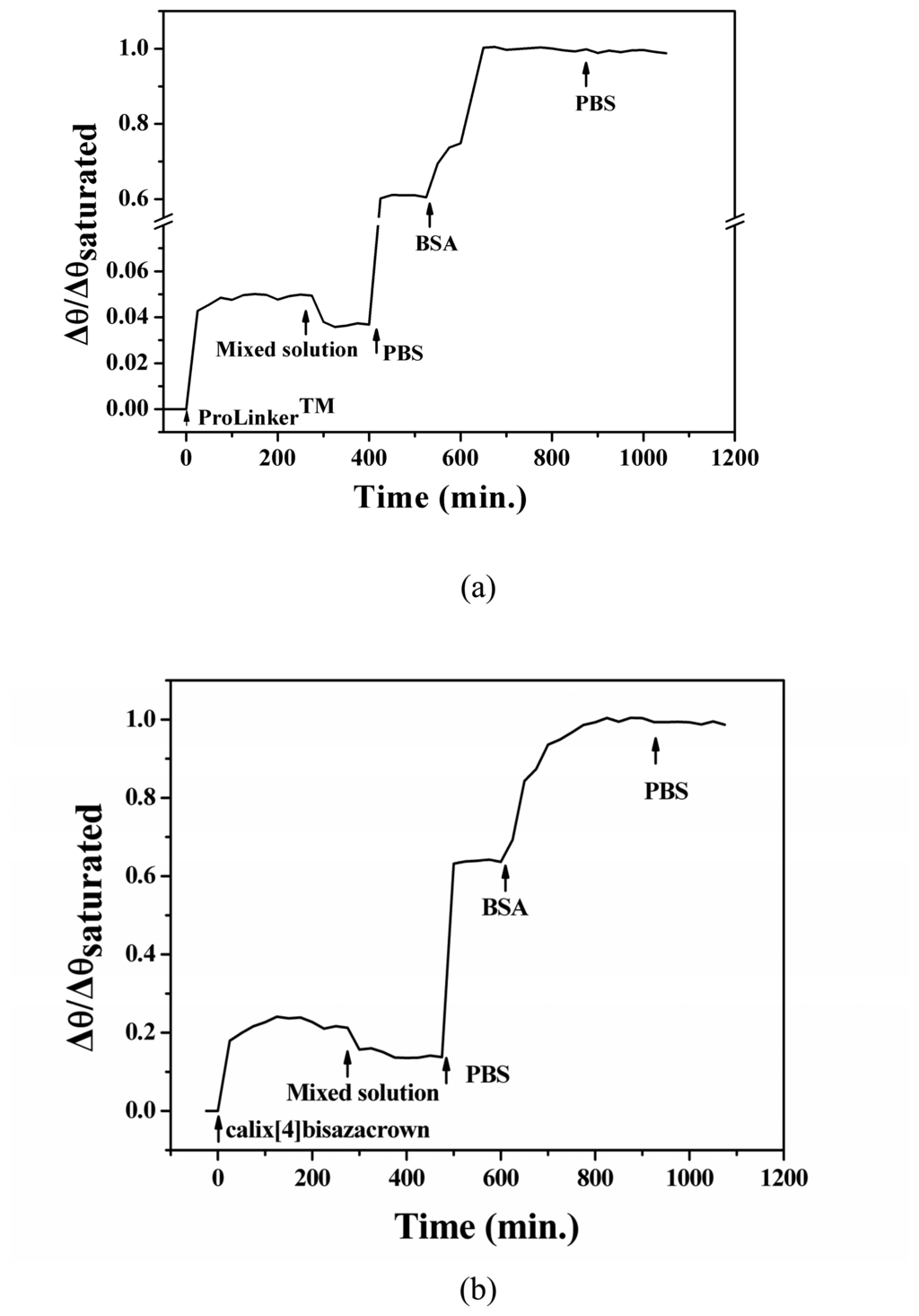 A gold chip (2 nm chromium adhesion layer and 45 nm of gold) constructed of one body with a prism (18 × 18 mm) was purchased from K-MAC (Daejeon, Korea). The bare gold chip surface was carefully rinsed with methanol and swelled in a mixed solution (CHCl3:MeOH = 1:199 (v/v)). ProLinker™ and calix[4]bisazacrown were prepared to 0.1 mM of the mixed solution (CHCl3:MeOH = 1:199 (v/v)) for the SAM formation on gold surface. The SAMs were formed by flow two solutions through two gold chips for about 5 h with a flow rate of 5 μL/min separately. The immobilization process was monitored by SPR spectroscopy. After the immobilization process, the sensor chip was sequentially rinsed with mixed solution, methanol and DI water.