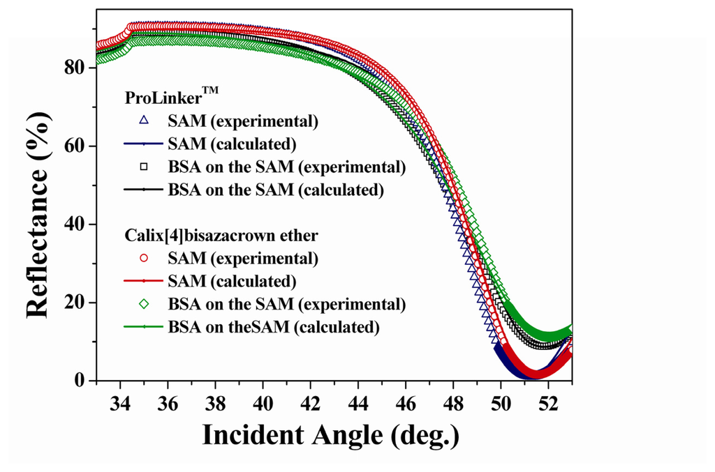 To calculate the protein surface concentration, the optical parameters are required by simulation with experimental SPR data. Figure 4 showed the experimental and calculated SPR curves of ProLinker™ and calix[4]bisazacrown SAMs according to the immobilization of BSA. The optical parameters of two SAMs were shown in Table 1. The calculated BSA surface concentrations are 175 ng/cm2 (on ProLinker™ SAM) and 197 ng/cm2 (on calix[4]bisazacrown SAM) respectively.