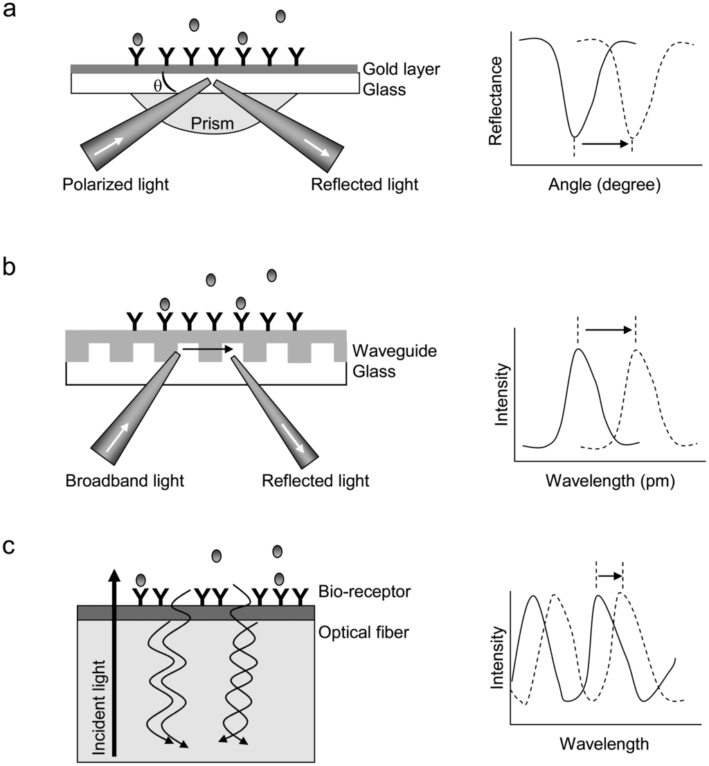 ) in solution bind to the immobilized receptors. (b) RWG biosensor. The coupling of incident light into the waveguide is achieved by the diffraction grating. The intensity of reflected light is a function of the resonant wavelength. The binding of target molecules in a sample to the immobilized receptors results in a shift in the resonant wavelength. (c) Interferometric biosensor. A broadband light resource is directly incident at the solution-surface interface. Two types of reflected light waves originated from the two reflecting surfaces, the interface with the optical layer and the surface of bio-receptors, interact each other, leading to interference patterns. The binding of biomolecules to the bio-receptors alters the inference pattern.