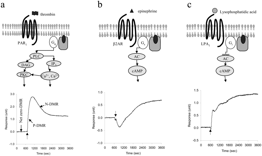 GPCRs represent the largest family of cell membrane receptors [37], and the largest of druggable targets in human genome [38]. Their primary function is to transduce external signals into an array of cellular responses, through both G protein-dependent and independent pathways. Using panels of agonists targeting many GPCRs, three classes of DMR signals in native human epidermoid carcinoma A431 cell were identified [15] (Figure 4). Since each is correlated with the activation of a class of GPCRs depending on G protein with which the receptor is coupled, the DMR signals obtained are named Gq-, Gs- and Gi-DMR signals, respectively. These DMR signals exhibit distinct kinetic and dynamic characteristics, reflecting the unique signaling integration mediated through different classes of GPCRs. Interestingly, the Gq-type DMR signal appears to be rapid, whereas the Gs-type DMR signal is comparatively slow.