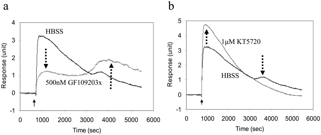 Chemical intervention reveals dual signaling of bradykinin B2 receptor in A431 cells. The bradykinin-induced DMR responses of cells pre-treated with the buffer only (HBSS) were in comparison with those pretreated with 500nM GF109203x (a protein kinase C inhibitor) (a), or 1 μM KT5720 (a protein kinase B inhibitor) (b). The bradykinin concentration was 16nM, and the cells were starved with 0.1% fetal bovine serum medium for 18hrs before assays. The solid arrows indicate the time when the agonist solution is introduced. Data was reproduced with permission from ref. 10.