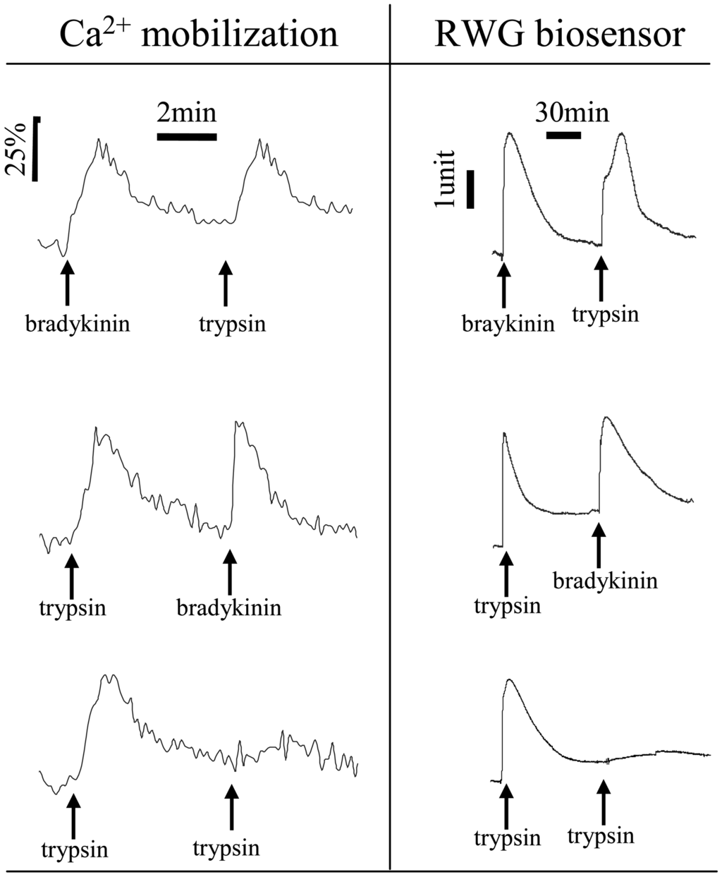 GPCR agonist-induced DMR signals follow classical desensitization patterns, similar to those measured with Ca2+ mobilization assays. A431 cells responded to repeated stimulation with distinct combinations of two agonists: bradykinin and trypsin, for endogenous B2 receptor and protease activated receptor subtype 2 (PAR2), respectively. Data was reproduced with permission from ref. 16.