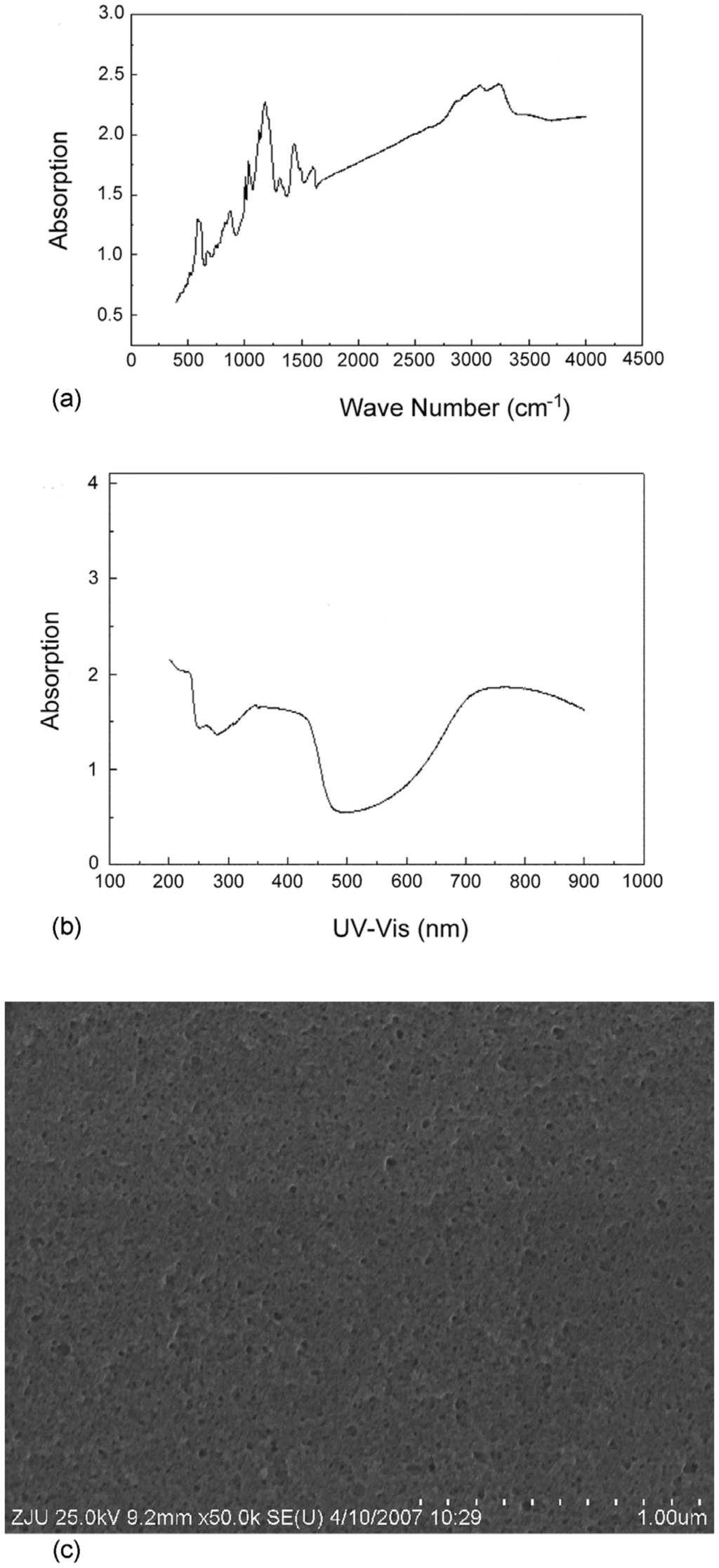 Polyaniline was prepared by polymerization of aniline with chemical oxide method as described previously []. A small amount of poly(sodium- p-styrenesulfonate) was added in a 0.1 M hydrochloric acid solution containing 0.01 M aniline and ammonium peroxydisulfate. The mixture was left undisturbed for 24 h, and then blue-black aqueous solution of polyaniline was obtained. The FTIR spectra of water-soluble polyaniline were recorded in silicon disks with an IFS66 V/S Fourier transform infrared spectrometer (Bruker Company). The UV-vis absorption of water-soluble polyaniline on the quartz glass was recorded by a CARY Bio100 spectrophotometer. The SEM image of soluble polyaniline composites coated on the glass was studied by an S-4800 (Hitachi Company) electron scanning microscope.