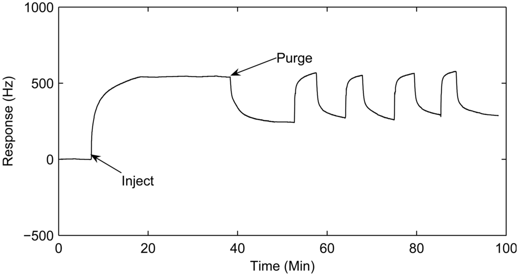 When the analyte was introduced to the sensor chamber, the polyaniline film absorbed the analyte and the sensing QCM's frequency decreased. The frequency decrease of the sensing QCM resulted in an increase of the frequency difference. Change of the frequency difference was defined as the sensor's response to gases.