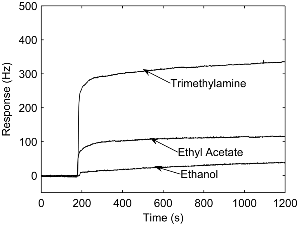 Experiments were carried out at room temperature and atmospheric pressure. The gases used during the investigation were trimethylamine, ethanol and ethyl acetate. For each vapour, 10 mL solution rested on the bottom of a 1000 mL glass container for at least 20 min, so that saturated volatile organic compounds could be extracted in the headspace of the container as analyte. High-purity N2 gas passed through the sensor chamber until the frequency difference became stable. Appropriate analyte concentrations were obtained in the test chamber by injecting known volumes of headspace gas via a gas tight syringe. The sensors were exposed to each vapour for 5 min, and then were purged by high-purity N2. The frequency difference was recorded every 1 s in the system. The computer is used to store this data and process it later.