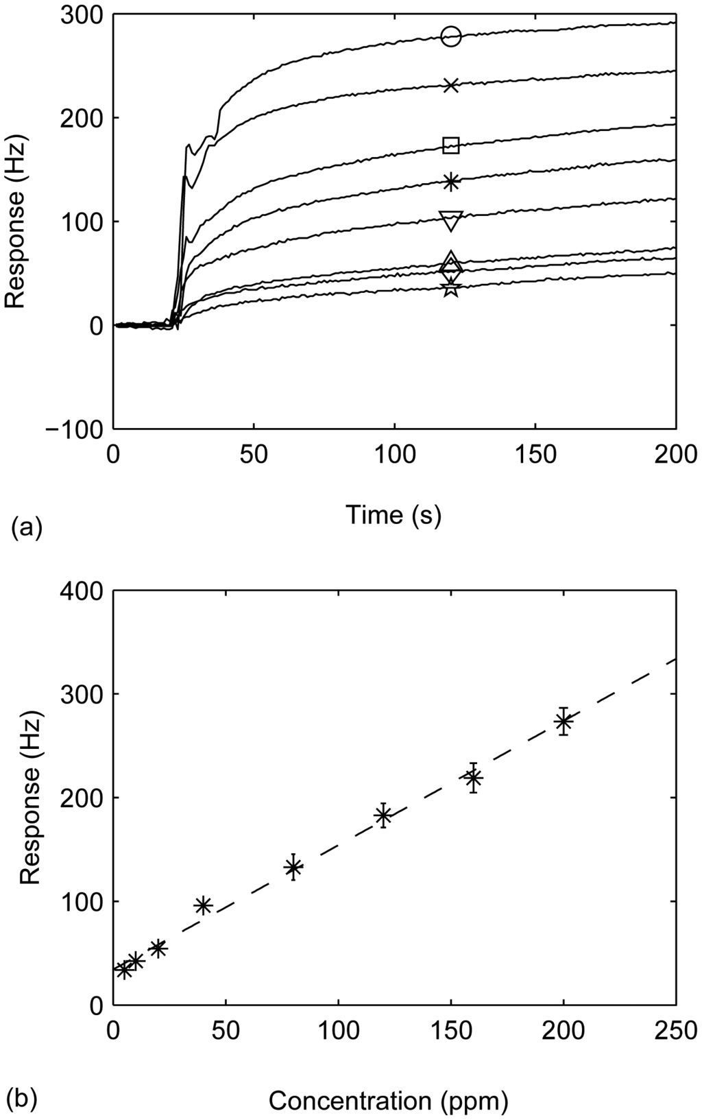 (a) Polyaniline-coated QCM sensor's responses to a 5(☆), 10(◇), 20(△), 40(▽), 80(﹡),120(□), 160(×) and 200(○) ppm (v/v) of trimethylamine in N2; (b) Polyaniline-coated QCM sensor's responses versus concentration of trymethylamine in N2