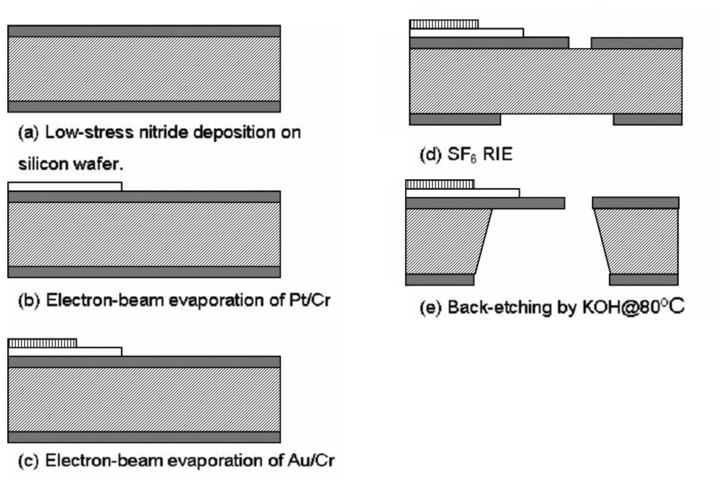 Figure 6 presents a schematic overview of the fabrication process employed to create the freestanding micro-cantilever beam and platinum piezoresistor. The fabrication procedure commenced by depositing a 1.0 μm low-stress nitride layer on either side of a silicon wafer of thickness 500 μm using a low-pressure chemical vapor deposition process. Using an electron-beam evaporation process, a thin (0.02 μm) chromium adhesion layer was deposited on the nitride layer followed by a platinum layer with a thickness of 0.1 μm. The same deposition technique was then used to deposit an Au layer of thickness 0.4 μm on top of the platinum layer to connect the piezoresistor to the external LCR meter. The freestanding micro-cantilever structure was created by patterning the upper and lower nitride layers using SF6 RIE plasma and then releasing the structure by performing a back-etching process using a KOH etchant (30 wt%, 80 °C) with the front face of the wafer shielded using a Teflon protector.