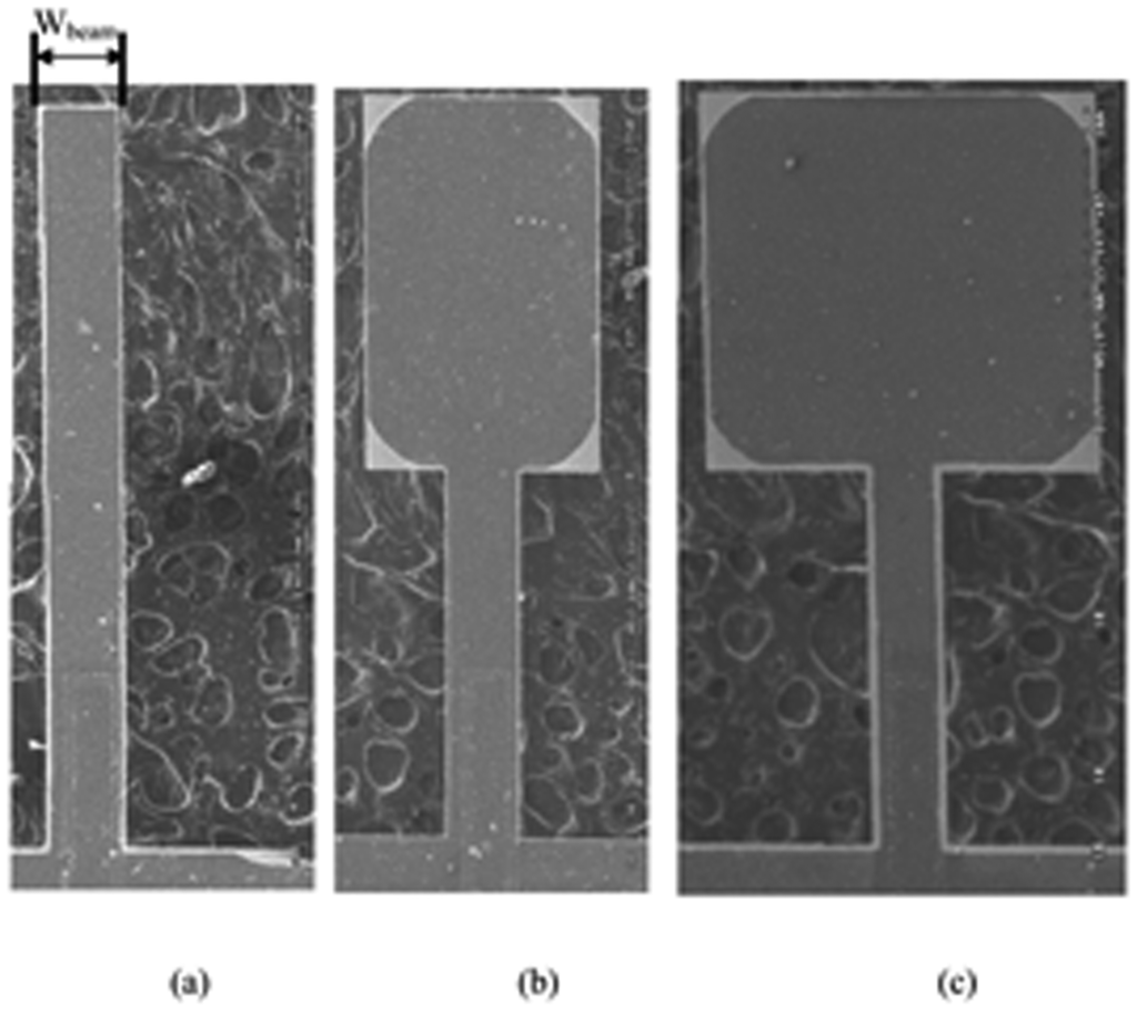 SEM images of cantilever beams. (a) Wbeam = 400 μm, (b) Wbeam = 1,200 μm and (c) Wbeam = 2,000 μm.