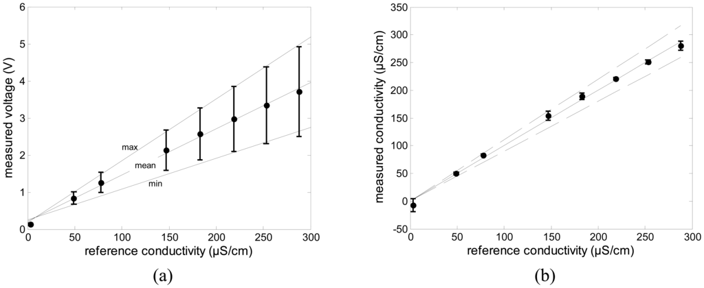 The measurements for the conductivity value of 3 μS/cm have a too low voltage level (mean value of 130 mV, see Fig. 3a), thus being more sensitive to noise and consequently lowering the accuracy of measurements. If lower conductivities values are to be investigated with the sensor, some parameters of the electronics such as amplifier gains or the excitation voltage level can be easily adapted for a new operation range.