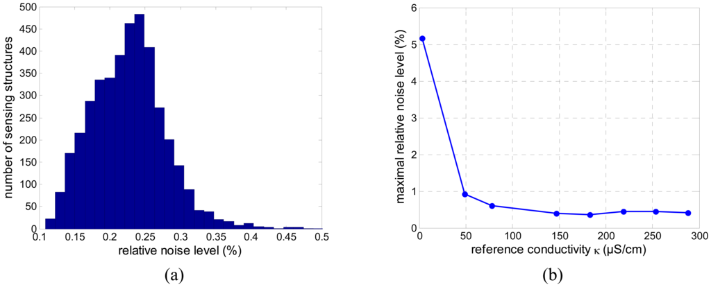 (a) Exemplary relative noise level distribution for a reference conductivity value of 147 μS/cm. (b) Maximal relative noise level for several reference conductivity values κ.