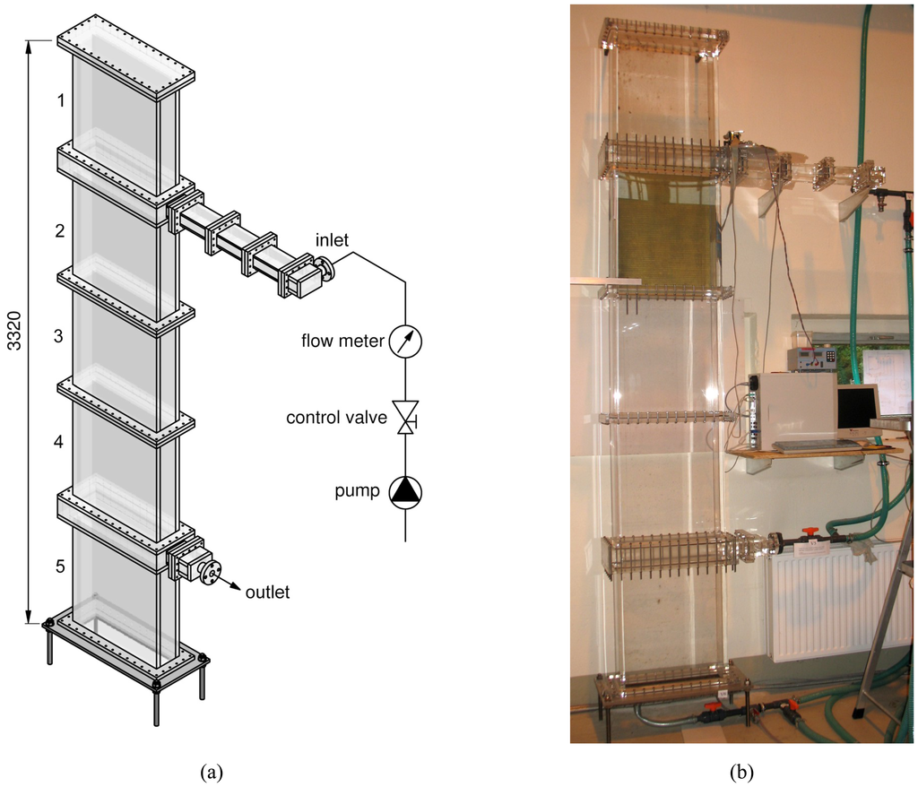 Many fluid flows are driven by buoyancy, the tendency of hot fluid being less dense to rise, and cold fluid to sink. Buoyancy-driven flow is often present in engineering application, for instance the cooling of nuclear reactors and electronic components and the spread of pollutants through groundwater. Especially the problem of fluid mixing in nuclear reactors has been the scope of investigation of many researchers [12,13]. However, the influence of buoyancy is still not well understood in such scenarios regarding modeling and implementation in CFD due to the high complex geometry of the test facilities used, which are down-scale models of currently in use reactor vessels [14]. To investigate the phenomena involved with buoyancy a very simple test rig was designed and constructed which ensures that the gravity force acts along a significant length scale. To visualize the mixing process of two liquids having different densities in a controlled manner the following experiment was carried out. A schematic diagram of the test facility is shown in figure 6. It is 3.32 m high. Five identical rectangular segments as described in section 2 (Fig. 1) are attached together. The inlet is placed in between segments 1 and 2, while the outlet is positioned in between segments 4 and 5. Segment number 2, right after the inlet, is instrumented with the planar sensor. In this region the most interesting mixing process occurs.