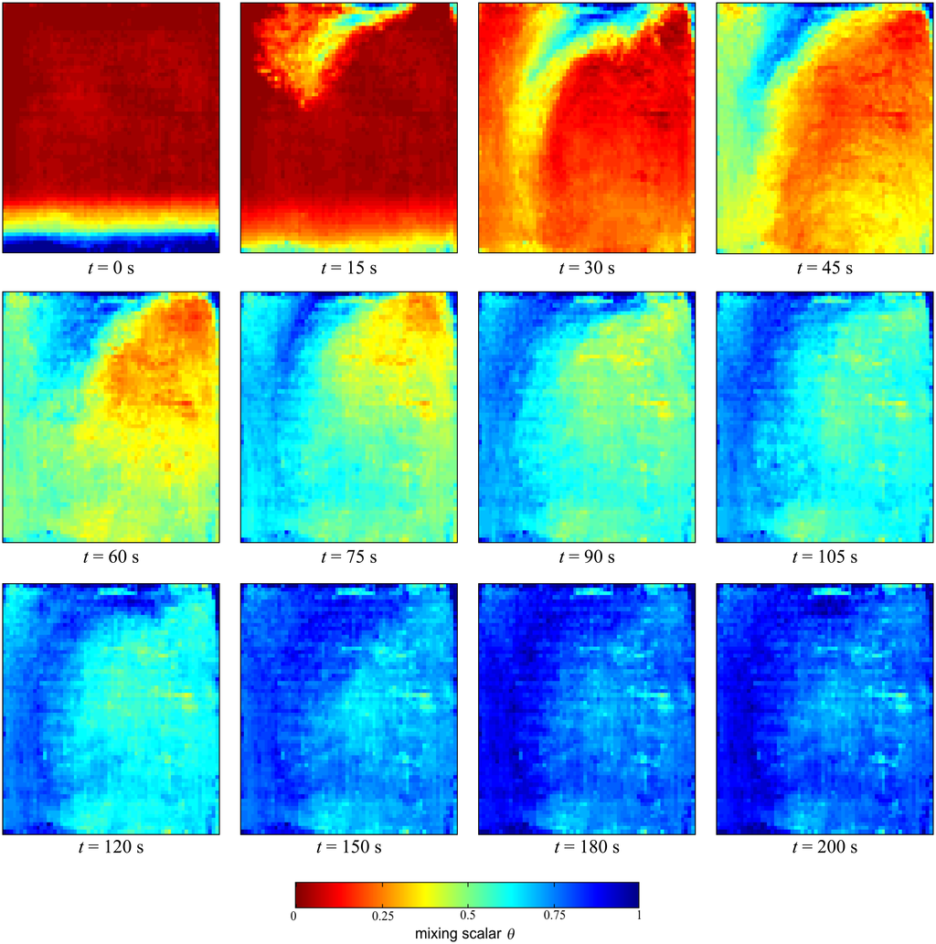 The execution of the experiment consists of few subsequent steps. First clean water is added into the test section up to the bottom of segment 2. Second water-glucose solution is very slowly inserted from the bottom taking the care not to mix the both components. This way, a layered structured is obtained having clean water in segments 1-2 and the more dense water-glucose solution in segments 3-5. This well-defined initial condition is very important for later comparison purposes with CFD simulations. Finally, the mixing process is initiated by flowing water-glucose solution through the inlet with a constant flow rate of 0.35 L/s. The process was monitored with the planar sensor for 200 s at 300 fps. Since the mixing process is rather slow the frame frequency could also be lowered. Figure 7 depicts twelve instantaneous mixing scalar θ distributions over the sensor surface. In the image for t = 0, the boundary between the two components as well as a transition region can be observed. It is very clear to see the formation of a circular jet, as the water-glucose solution flows into the channel. The time-resolved imaging of the process can reveal some details about the mixing behavior of two miscible liquids with different densities. In a later phase CFD simulations for different flow rates and density gradients will be validated with the experiments carried out with the planar sensor.