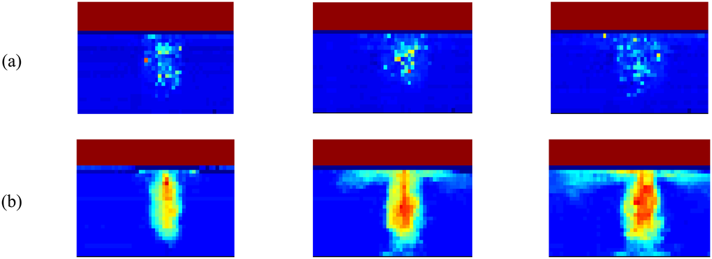 With the above described procedure images of the instantaneous fluid distributions across the sensor can be generated by mapping the wetting level w(i,j,k) or conductivity values κ (i,j,k) to a color scale and then plotting them in the spatial directions of i and j for a fixed value of index k. Furthermore, sequences of these distributions can be viewed as video sequences by stepwise incrementing the temporal index k.