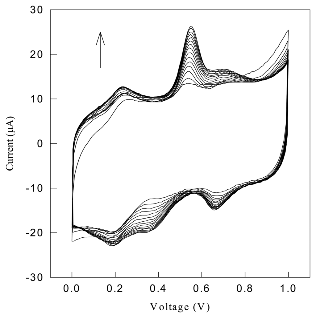 Cyclic voltammograms in the eletrodeposition of copper-cobalt hexacyanoferrate films from a solution of 0.5 M KCl, 0.33 mM CuCl2, 0.33 mM CoCl2, and 0.66 mM K3Fe(CN)6 from 0 to 1.0 V at 50 mV s-1.