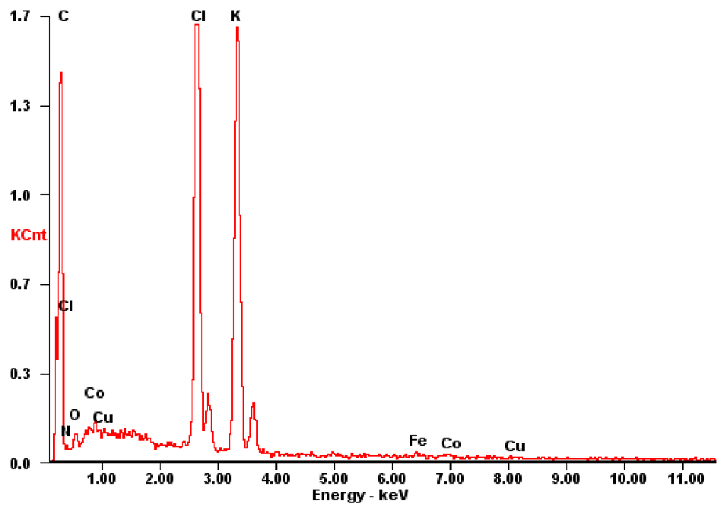 Figure 1 illustrates the cyclic voltammogram during the electrodeposition process. The consecutively increasing currents for both anodic and cathodic peaks demonstrate the CuCoHCF films are deposited continuously on the electrode surface. Three pairs of redox peaks of this film appeared near 0.20, 0.50 and 0.65 V. The peaks at 0.50 V and 0.65 V are associated with the redox process between [Fe(CN)6]2- and [Fe(CN)6]3- in the CuCoHCF films [24]. Unlike the report [24], a pairs of peaks at about 0.20 V was found, which may be due to the redox process of free Fe(CN)64-/3- in the solution, since these two peaks disappeared if the modified electrode was transformed to KCl solution without K3Fe(CN)6. Figure 2 was the EDS spectra of the CuCoHCF modified graphite electrode. It shows that C, Co, Fe, Cu, K, and Cl are the major elements, which confirm that the hybrid HCFs of iron, cobalt and copper are deposited on the gold electrode surface.