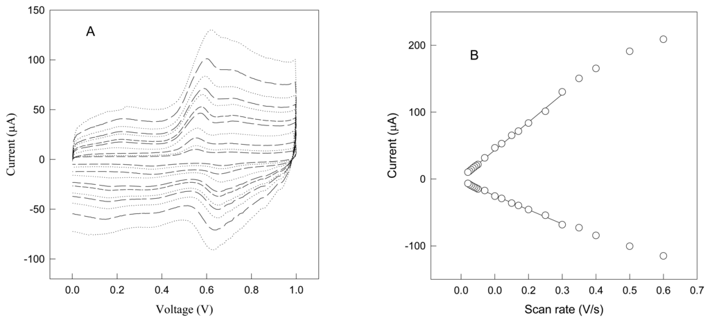 Then, the modified electrode was transformed to 0.5 M KCl solution and the cyclic voltammograms at various scan rates were recorded as in Figure 3A. With the increase in scan rates, the cathodic and anodic current both increased. As the peaks at 0.5 V an example (Figure 3B), the peak currents were linearly proportional to the scan rates in the range between 20 and 300 mV s-1. The ipa/ipc was almost unity, as expected for a surface-type behavior. This deviation of redox process, from the ideal surface redox behavior appeared at even low scan rates, may be attributed to the limitations associated with charge propagation in the film, chemical interaction between the ions and the modified film, polarizability of the cation influencing its penetration in or out of the CuCoHCF film [15].