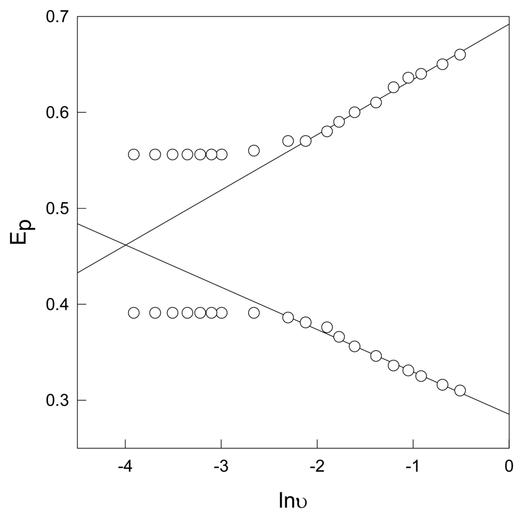 Relationship between the peak potential (Ep) and the natural logarithm of scan rate (ln ν) for CuCoHCF-modified electrode in 0.5 M KCl solution and the linear fitting at scan rates from 170 mV/s to 600 mV/s.