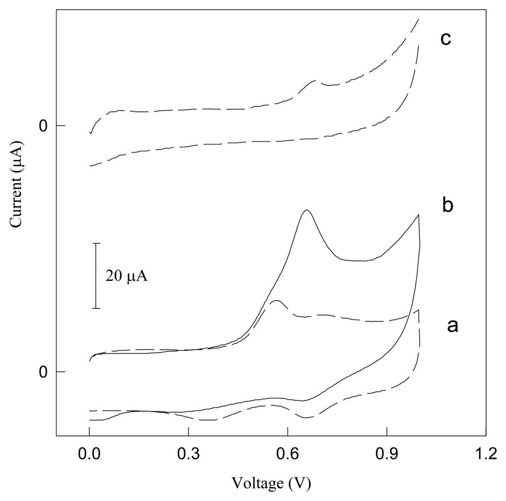 Figure 5 shows the cyclic voltammograms of CuCoHCF film-modified graphite electrode in 0.5 M KCl solution (a) and in the presence of 300 μM tryptophan (b) and also the cyclic voltammogram of tryptophan (c) at the surface of the bare electrode. At a bare electrode, the direct oxidation of tryptophan is not significant, and just a small anodic current due to the oxidation of tryptophan is observed. However, if the electrode is modified with CuCoHCF film, and then placed in the electrochemical cell containing tryptophan, a large anodic peak is observed with cathodic peak current decreasing accordingly. Therefore, it can be indicated an electrocatalytic process has occurred.