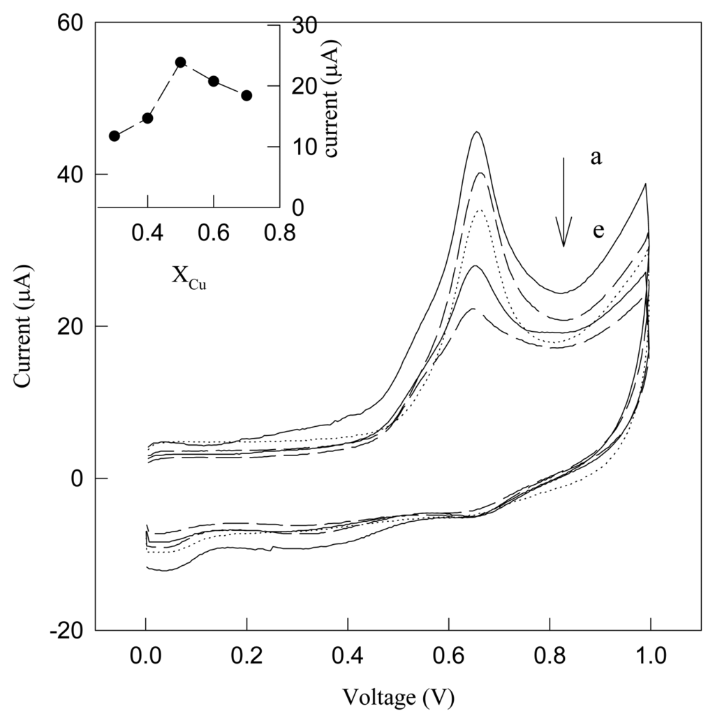 Cyclic voltammograms of the CuCoHCF film deposited from the solution with different χCu values to tryptophan in 0.5 M KCl solution are shown in Figure 6. During the deposition, the concentration of KCl and K3Fe(CN)6 were kept constant as 0.5 M 0.66 mM, respectively. From the inset of Figure 5, it can be seen that the response current gradually increased with increase in χCu from 0.3 to 0.5, while clearly decreased higher than 0.5. The oxidation voltages at higher potential (about 0.65 V) showed a little difference at different ratio, therefore, at the ratio of Cu(II) and Co(II) with 0.5, the CuCoHCF exhibit the best electrocatalytical response to tryptophan, and in the following work, the ratio was selected as 0.5.