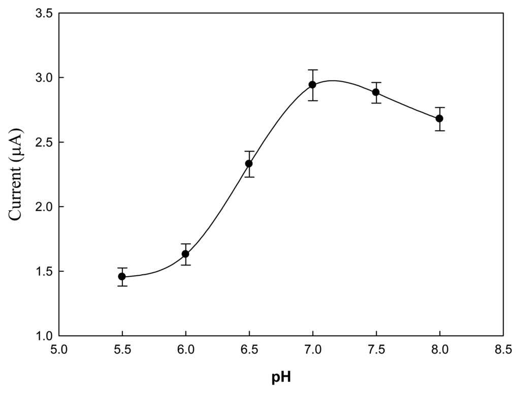 In order to optimize the solution pH for tryptophan detection, the effect of pH on the response current was studied in buffered solution (1/15 M PBS) containing 0.5 M KCl. The pH is adjusted by different ratio of KH2PO4 and Na2HPO4. The relationship between steady-state current and pH value is shown in Figure 7. There was a little increase of the response in the catalytic current at lower than 7, however, a decrease in the catalytic current above pH 7 was observed, which may be due to the hydroxylation of CuCoHCF film in the alkaline conditions. Furthermore, the activity of tryptophan is much higher at its isoelectric point, so the higher current response may occur at this pH value. Thus, for the consistence of the film preparing solution and the detection solution, pH value of 7 is selected.