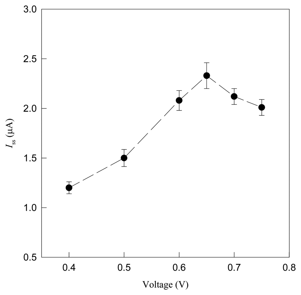 To optimize the applied potential for the tryptophan determination, the effect of applied potential on the response current was investigated. As shown in Figure 8, the response current gradually increases with the applied potential from 0.4 V to 0.65 V, while decrease if the potential is higher than 0.7 V.