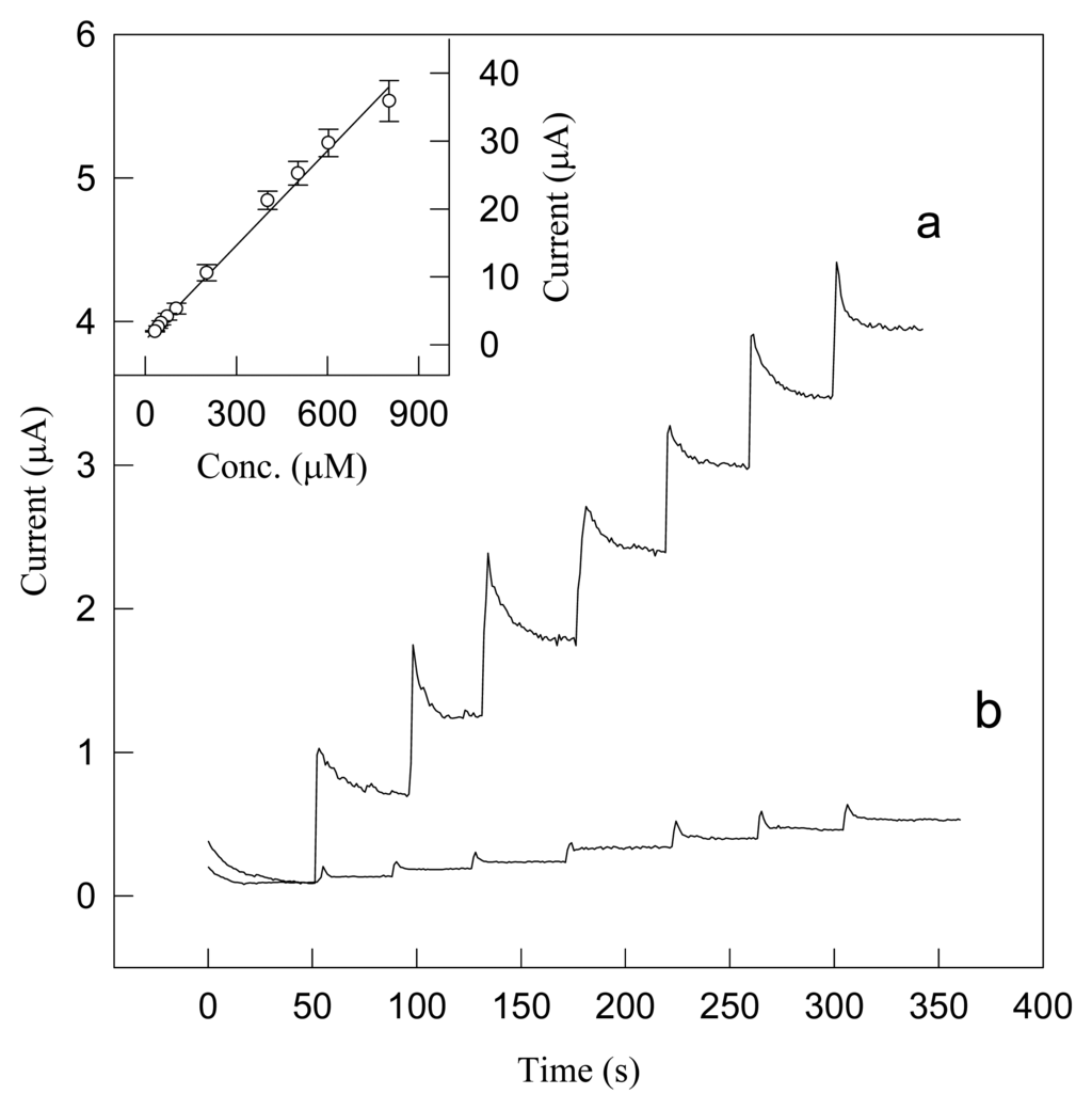The current response to successive addition of tryptophan in 0.5 M KCl solution: (a) bare graphite electrode and (b) CuCoHCF-film modified electrode. The inset is the relationship of the current response of (b) with the tryptophan concentration. Applied potential: 0.65 V.
