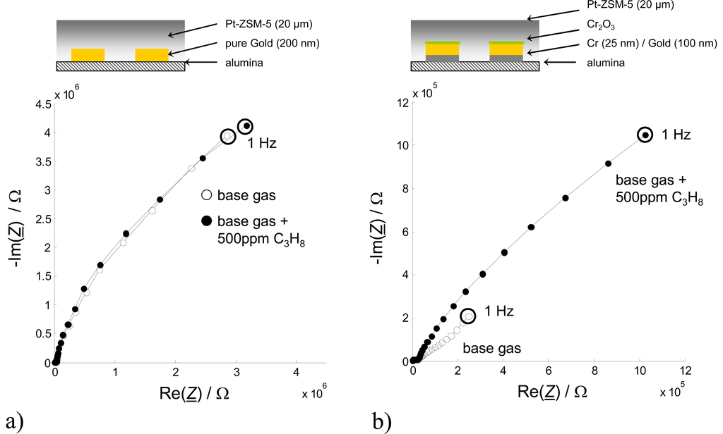 Impedance spectra (Nyquist Plots) and scheme of the setup of Pt-ZSM-5 covered Au-IDE (a) and Au/Cr2O3-IDE (b) with (●) and without (o) 500 ppm propane in a base gas mixture of 2.5 % H2O and 10 % O2 in N2 at 300 °C. “○” indicates a measurement at a frequency of 1 Hz. Please note from the sensor setup that in (b) the Cr2O3 intermediate layer is applied only on top of the electrodes. The spaces between the fingers of the IDE are not Cr2O3-covered (see cross section).