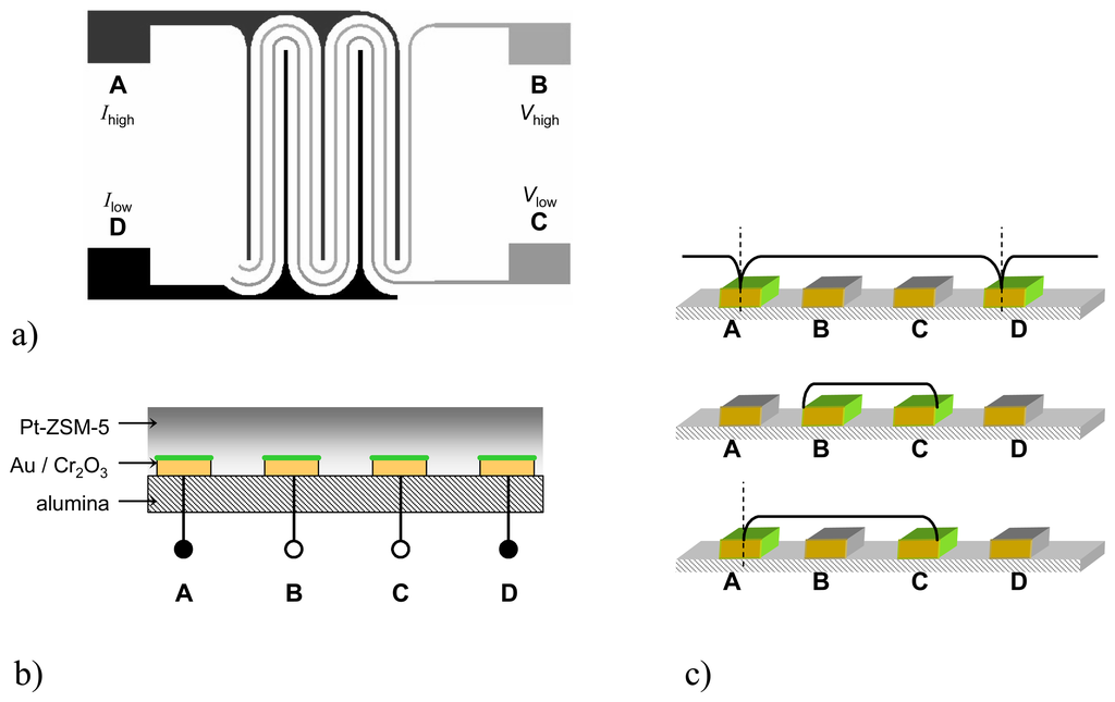 To obtain a two-dimensional planar setup with four separated electrodes, a configuration as shown in Fig. 2a was chosen. Between the wider-spaced IDEs A and D, two meandered electrodes (B and C) are interposed. In one operation mode, the current is applied to the outer electrodes A (Ihigh) and D (Ilow) and the resulting potential is picked off at the inner electrodes B (Vhigh) and C (Vlow) as shown in Fig. 2a. Recently, a similar setup was suggested for dc measurements to enhance selectivity and to discriminate two different gases [].