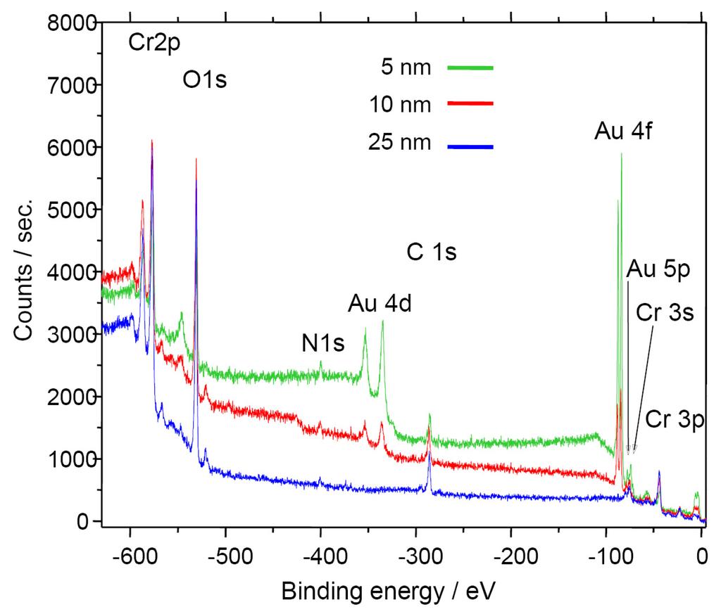 - George, M.; Glausinger, W.; Thundat, T.; Lindsay, S. Electrical, spectroscopic, and morphological investigation of chromium diffusion through gold films. Thin Solid Films 1990, 189, 59–72. [Google Scholar]