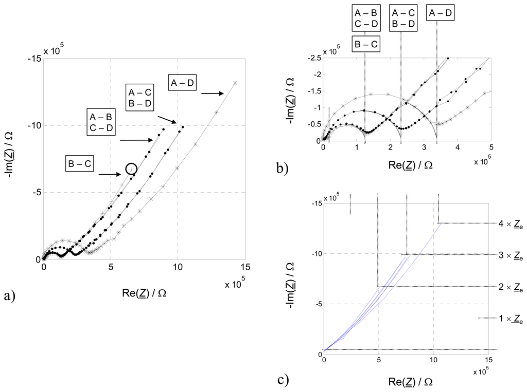 Likewise, two-wire connections of the inner electrodes (B – C) include 2 × Ze, but only 1 × Zzeo. Therefore, the high-frequency semicircle size representing the bulk impedance should be only one third of the above-mentioned result from Eq. (3). The low-frequency electrode part is expected to be 2 × Ze (Eq. 4).