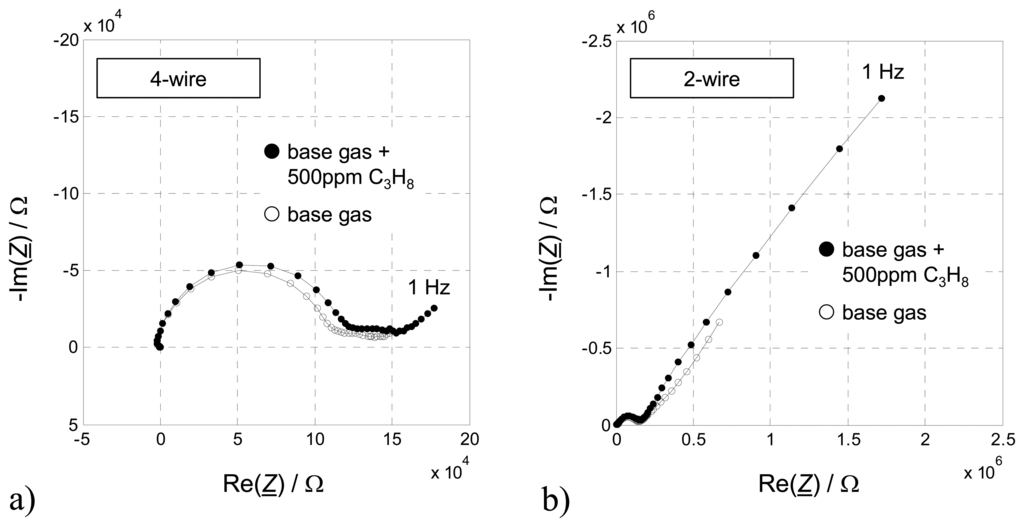 Impedance spectra (Nyquist Plots) with (●) and without (○) 500 ppm C3H8 of the four-wire (a) and the two-wire measurement (b).