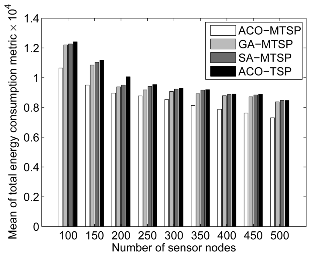 Figure 10. The mean of total energy consumption metric optimized by ACO-TSP, SA-MTSP, GA-MTSP and ACO-MTSP with the number of sensor nodes changing from 100 to 500, where the number of clusters is fixedly set to 5.