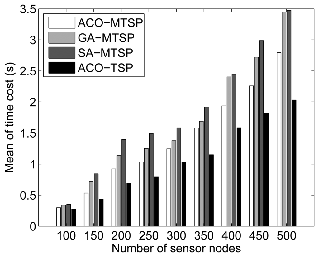 Figure 11. The mean of time cost for optimization in ACO-TSP, SA-MTSP, GA-MTSP and ACO-MTSP with the number of sensor nodes changing from 100 to 500, where the number of clusters is fixedly set to 5.