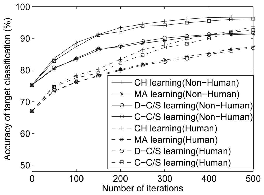 Figure 13. The classification accuracy of human target and non-human target with different number of iterations in four different learning paradigms.