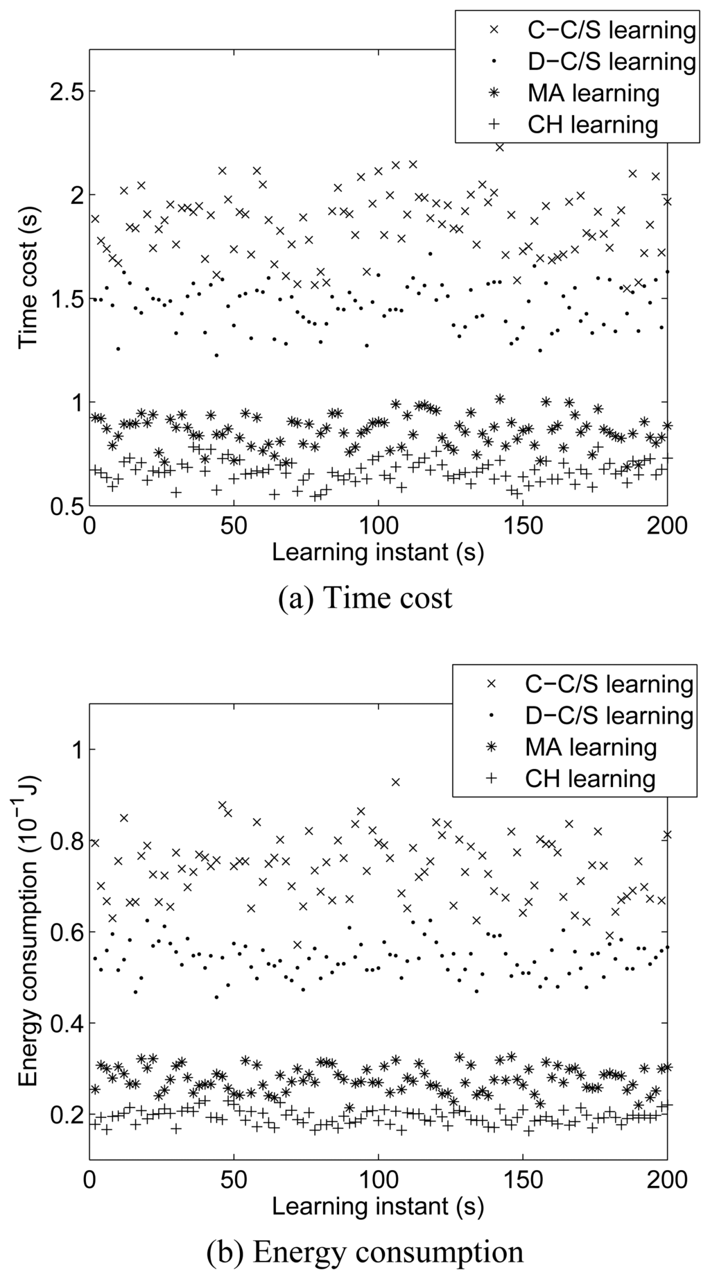 In summary, the classification accuracy, time cost and energy consumption of four learning paradigms verify that the proposed collaborative hybrid semi-supervised classifier learning algorithm has outstanding performance of online learning and classifying in WMSN with highly limited computing ability and energy resources.
