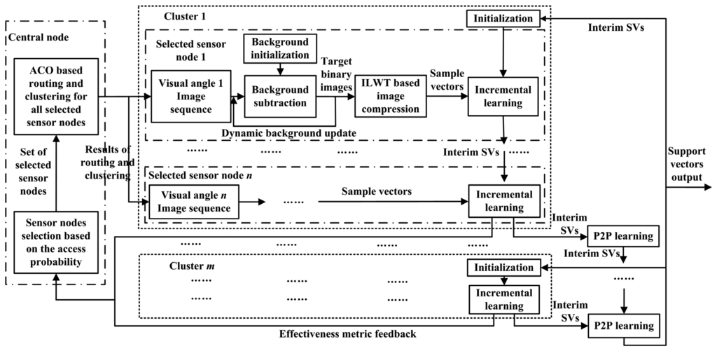 Support vector machine (SVM) is a well known classification tool, which has been widely used in WSNs [2-4]. However, SVM classifier learning calls applies to solving a quadratic programming problem [5], which is computation expensive and cannot be afforded by single sensor node with limited computing ability and energy. Furthermore, traditional classifier learning is a kind of centralized learning strategy, which also needs to acquire samples from all sensor nodes. The large amount of data transmission will consume much energy, which is impractical for a highly constrained WMSN. Recently, various incremental learning methods were proposed [4-6], which implies that the learning process can be progressively carried out with the collaboration of multiple sensor nodes. Although incremental learning is suitable for target classification in WMSNs, with the consideration of missing and false detection, the incremental learning should be collaboratively implemented according to the contribution of sensor nodes. This requires a new architecture to increase the system scalability with collaborative in-network processing by reducing the energy consumption and gathering the samples from a proper set of sensor nodes. Moreover, the SVM principle determines that the learning process needs a set of independent, identically distributed labeled samples. However, obtaining classification labels is an expensive and infeasible task for unattended WMSN, which determines that the traditional SVM classifier learning algorithm cannot be achieved online in WMSN.