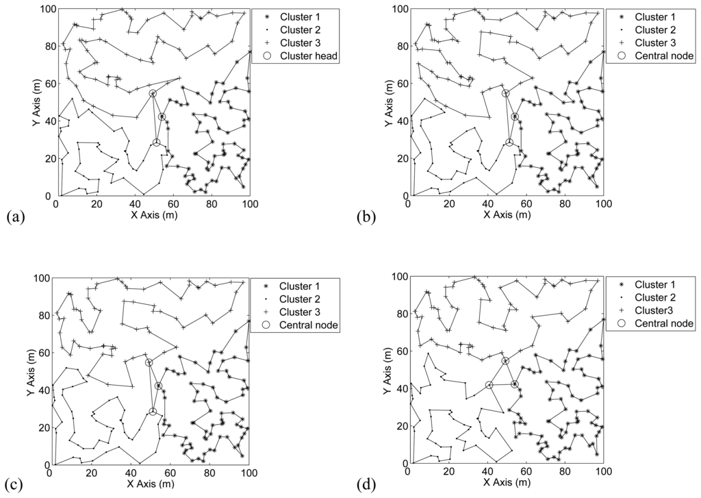 Figure 6. The routing and clustering results of (a) ACO-TSP, (b) SA-MTSP, (c) GA-MTSP, and (d) ACO-MTSP with the following parameters, N=200, m=3.