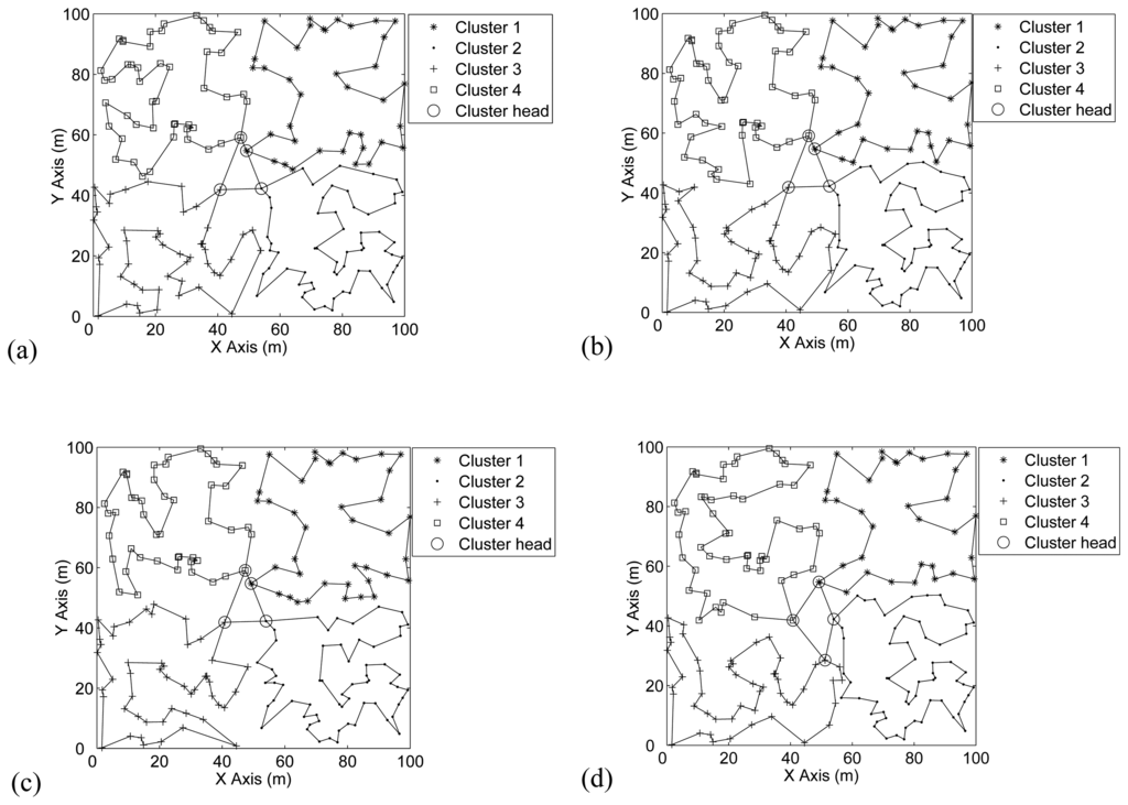 Figure 7. The routing and clustering results of (a) ACO-TSP, (b) SA-MTSP, (c) GA-MTSP, and (d) ACO-MTSP with the following parameters, N=200, m=4.