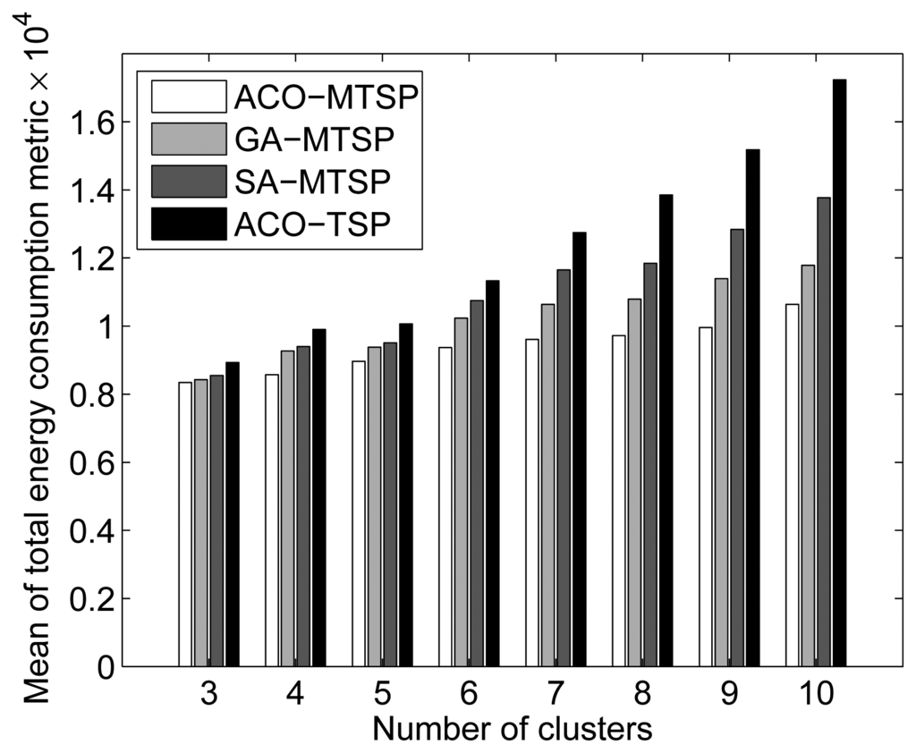 Figure 8. The mean of total energy consumption metric optimized by ACO-TSP, SA-MTSP, GA-MTSP and ACO-MTSP with different number of clusters, where the number of clusters changes from 3 to 10 and the number of sensor nodes keeps 200 for all experiments.