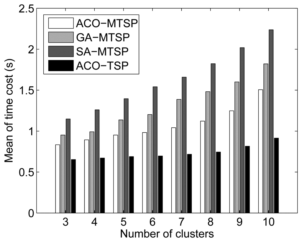 Figure 9. The mean of time cost for optimization in ACO-TSP, SA-MTSP, GA-MTSP and ACO-MTSP with different number of clusters, where the number of clusters changes from 3 to 10 and the number of sensor nodes keeps 200 for all experiments.