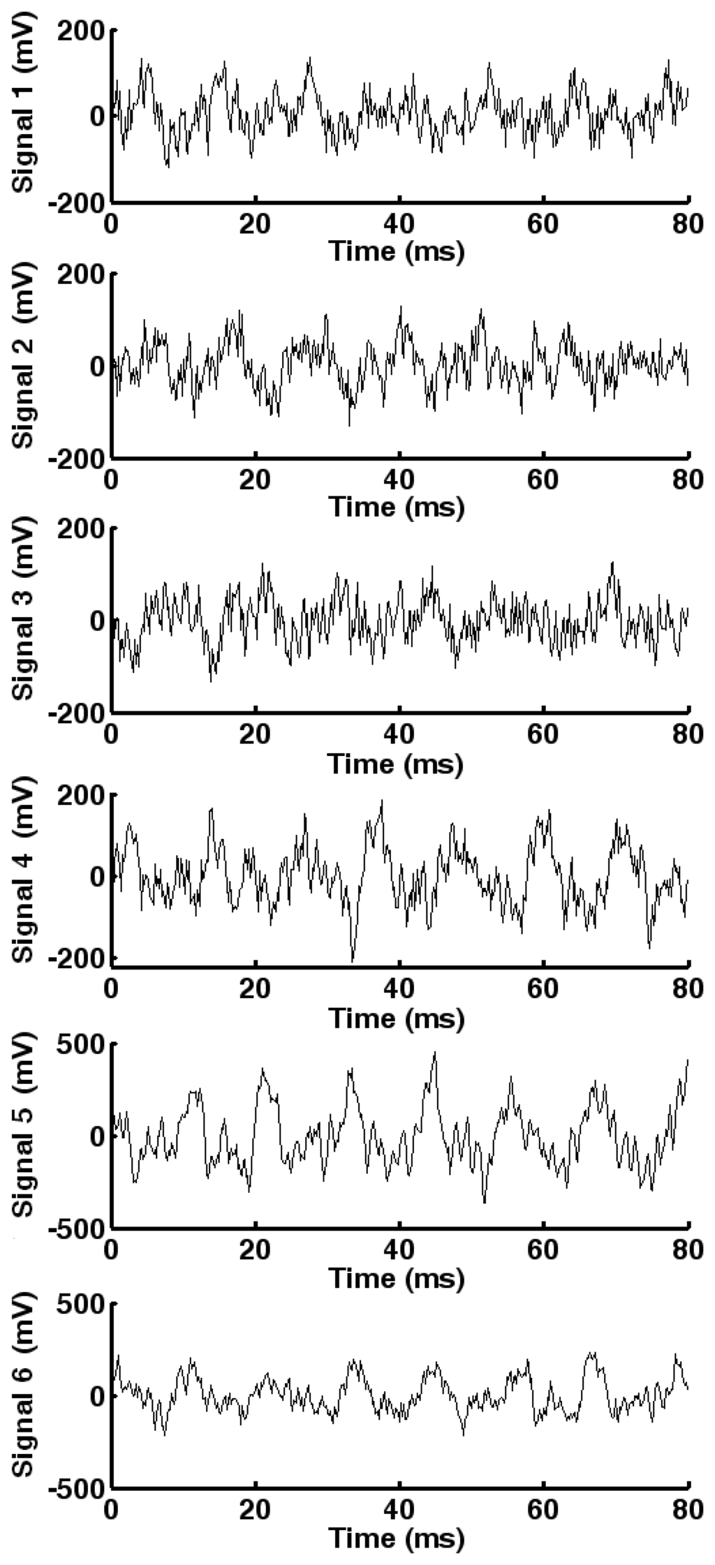 With this trained RBFN, the local decision of target position can be obtained by a single committee member. Along the target path, the acoustic signal from the sensor node on related hexagon will be analyzed. For each sensing period, the sensor node acquires a sequence of signal amplitude in the detection stage. According to the detection time and sampling frequency given in Section 5.1, the number of sample points is 396. Thereby, the normalized energy feature can be obtained following Equation (30). For instance, the acoustic signals from related sensor nodes are shown in Figure 12 when the target is located at (307.7 m, 237.6 m). For signal 1 to 6, the associated sensor nodes are located at (300.0 m, 173.2 m), (350.0 m, 173.2 m), (375.0 m, 216.5 m), (350.0 m, 259.8 m), (300.0 m, 259.8 m) and (275.0 m, 216.5 m) respectively.