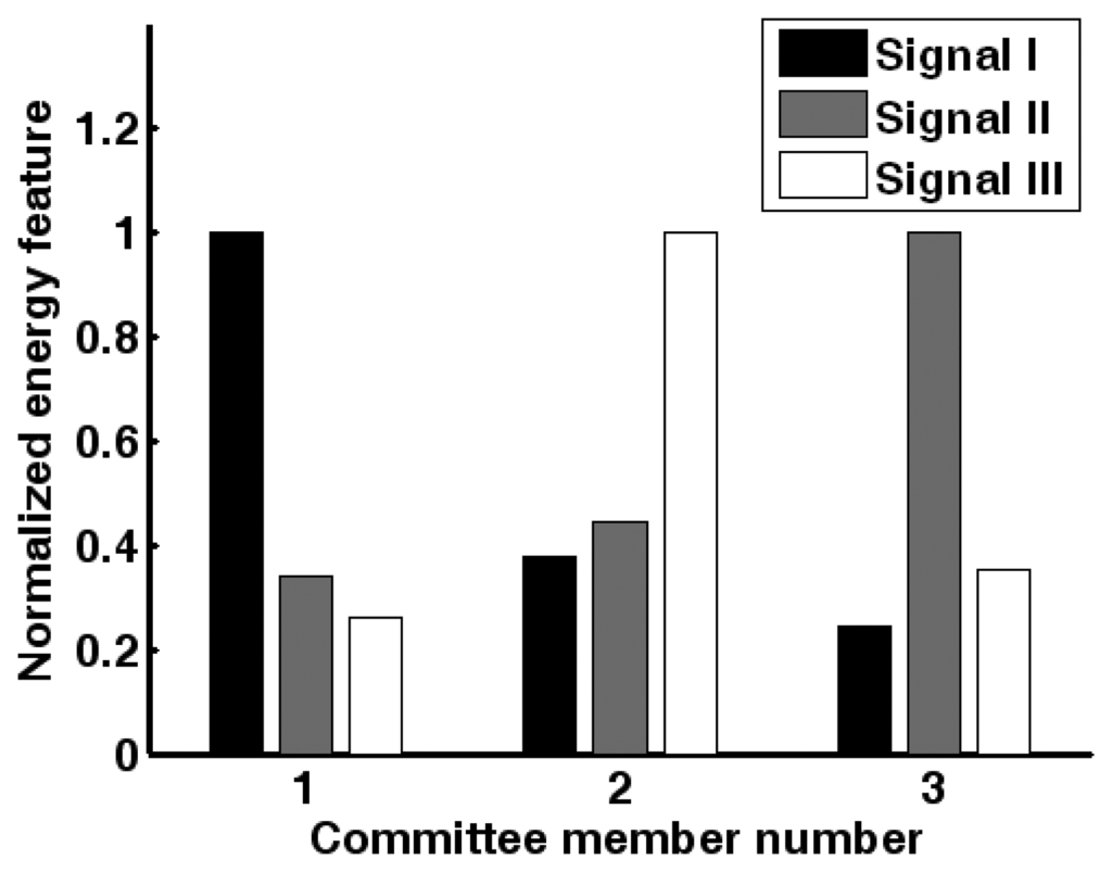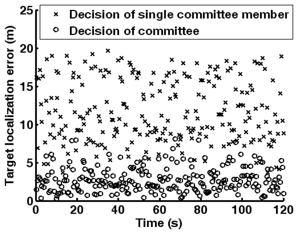 Here, the committee member 1 obtains the signal 1, 2 and 6; the committee member 2 obtains the signal 2, 3 and 6; and the committee member 3 obtains the signal 4, 5 and 6. The normalized energy features of each committee member are given by Figure 13. For each committee member, a new coordinate frame X′O′Y′ is established according to Figure 7. In X′O′Y′, the signals from the sensor nodes which are located at (0 m, 0 m), (50.0 m, 0 m) and (-25.0 m, 43.3 m) are denoted by signal I, II and III respectively. Taking the normalized energy features as input, the local decision of each committee member can be obtained by the RBFN. In this case, the results of target position are (305.4 m, 241.4 m), (304.6 m, 241.5 m) and (309.4 m, 236.7 m) for committee member 1, 2 and 3 respectively. The committee decision is (307.7 m, 238.5 m) according to Equation (35) and (36). It can be found that the committee decision get better results than the local decisions. Further investigation is performed to analyze the target localization with committee decision. With the target trajectory of Figure 11, the decisions of committee and single committee member are compared every sensing period. The target localization error is compared in Figure 14. Here, the decision of single committee member is made by the sensor node carrying the historical target information and its neighbors. Committee decision leads to higher accuracy of target localization.