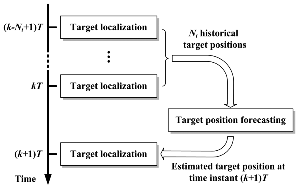 In this section, the energy-efficient target tracking method will be described in detail. With the defined network structure, the target tracking procedure is shown in Figure 4. In WMSN, target localization is performed with constant period T. For the k -th sensing period, the p historical target positions from (k−p+1)T to kT are utilized to forecast the target position at time instant (k+1)T. A novel algorithm, ARMA-RBF, is proposed to perform the target prediction.