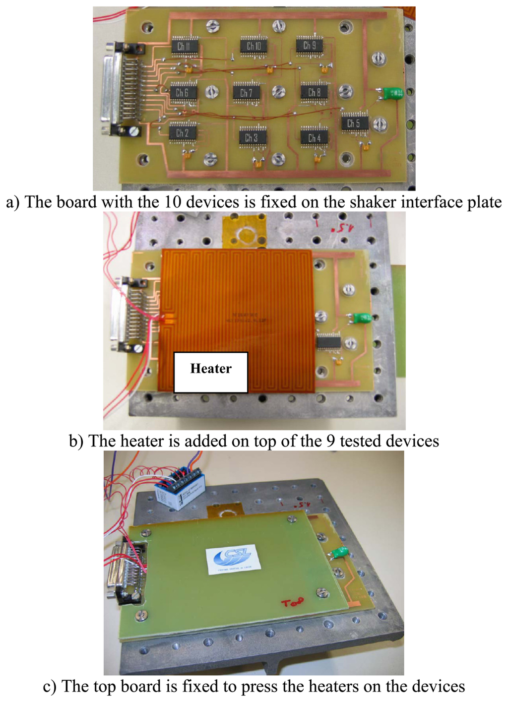 Testing at vibration and high temperature was executed by Centre Spatial de Liège - CSL (Université de Liège). The experimental set-up is shown in Figure 1. A board containing 10 devices, fixed on the shaker interface plate, forms the experimental setup (Figure 1a). Then, a heater (Figure 1b) was added on top of 9 devices (the 10th device being the temperature reference, held at room temperature – Ch5, in Figure 1a), with the temperature sensor taped on the bottom of the heater, and a top board is fixed to press the heater on the devices (Figure 1c).