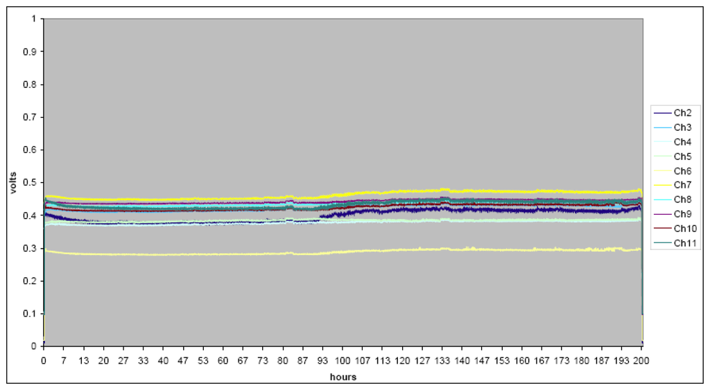 Up to 1000 hours, there was no failure and no visible degradation in the performance of the accelerometers during the test. However, this combined test (tilting + temperature & bias) was considered significant and desirable by the manufacturer of the accelerometers. This is because a combined test, with two or more stress factors is always more difficult for the device than each test applied separately, because the possible synergy of the stress factors could produce higher effects than each stress factor.