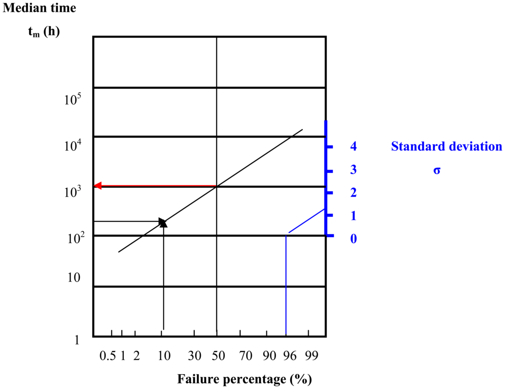 - On the lognormal probabilistic paper (Figure 5), the standard deviation is proportional with the slope of the line drawn between the point (96%,100h) and the standard deviation value on the scale marked in blue. Hence, the model describing Median time vs. Failure percentage must have the same slope with this blue line. Consequently, for obtaining this model, the point (11.1%;201h) is represented and a straight line, parallel with the standard deviation line (the blue line) is drawn. The intersect of this straight line with the 50% line gives the time moment for the failure of 50% of the sample S2 (see Table 2), i.e. the median time of this distribution, which is 1000 h (see red arrow).